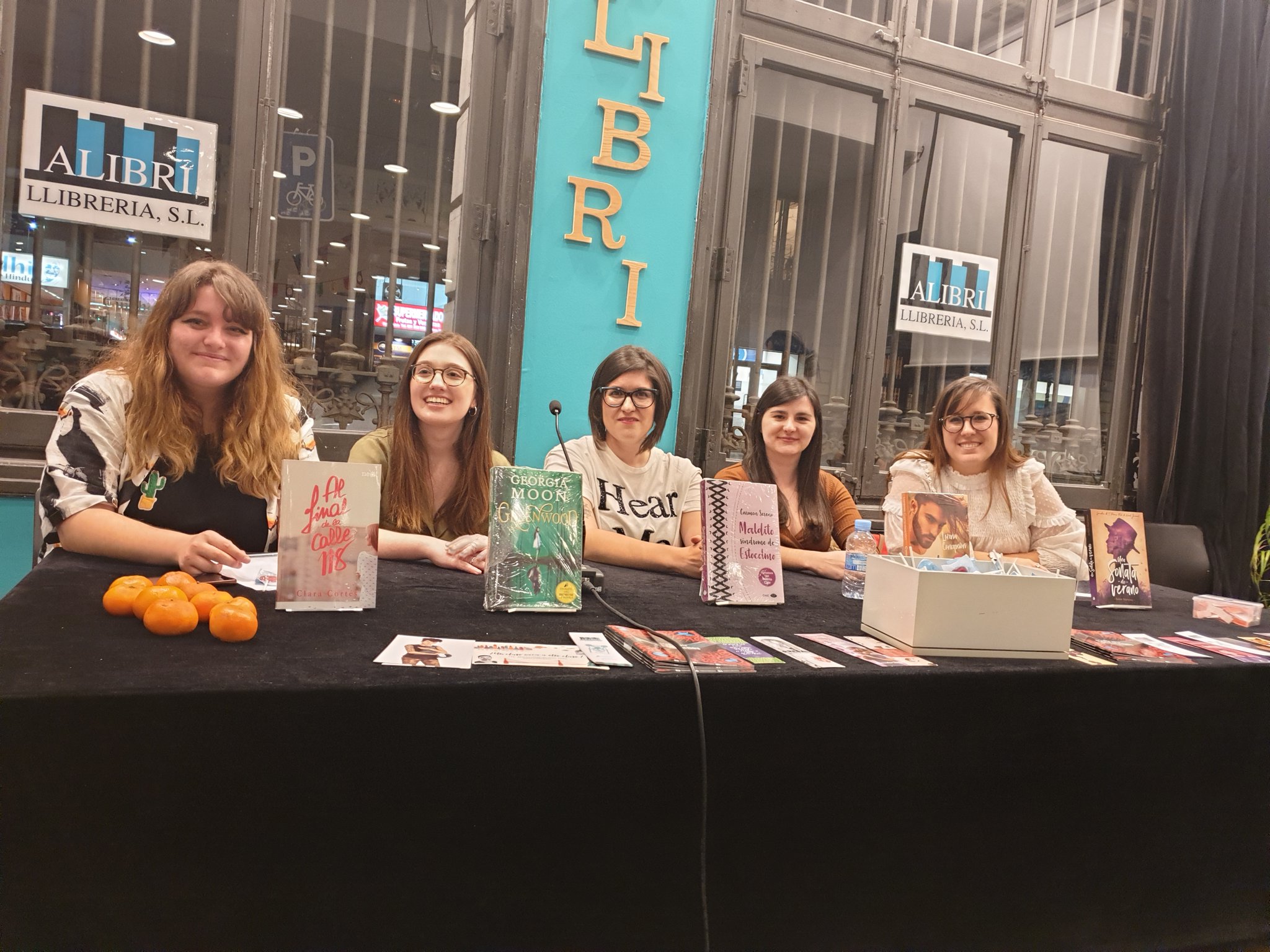 | De izquierda a derecha: Clara Cortés, Georgia Moon, Carmen Sereno, Lorena Concepción y Belén Martínez, en la charla de experiencias en los premios literarios. |